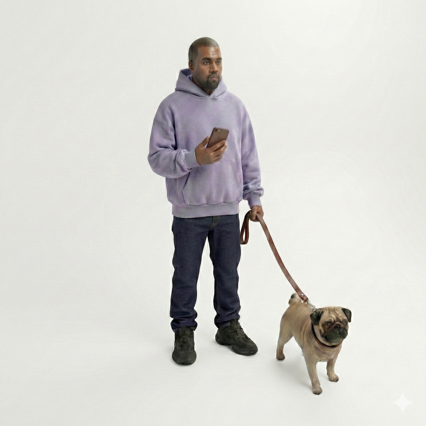 Outfit: A heavy-weight, washed lavender purple hoodie with the hood up and a kangaroo pocket. Dark indigo, straight-leg raw denim jeans, slightly baggy and stacked over black Yeezy 500 sneakers.